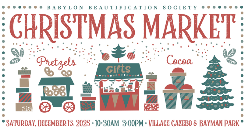 The Babylon Beautification Society is pleased to host an outdoor Christmas Market held from 10:30 am to 3:00 pm on Saturday, December 13, 2025, at the Village Gazebo and Bayman Park. The rain date for the event is Sunday, December 14, 2025.